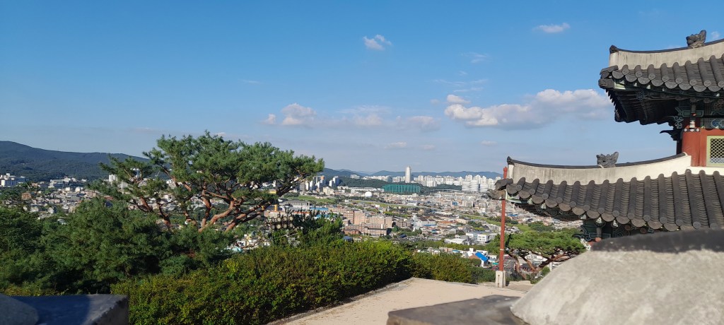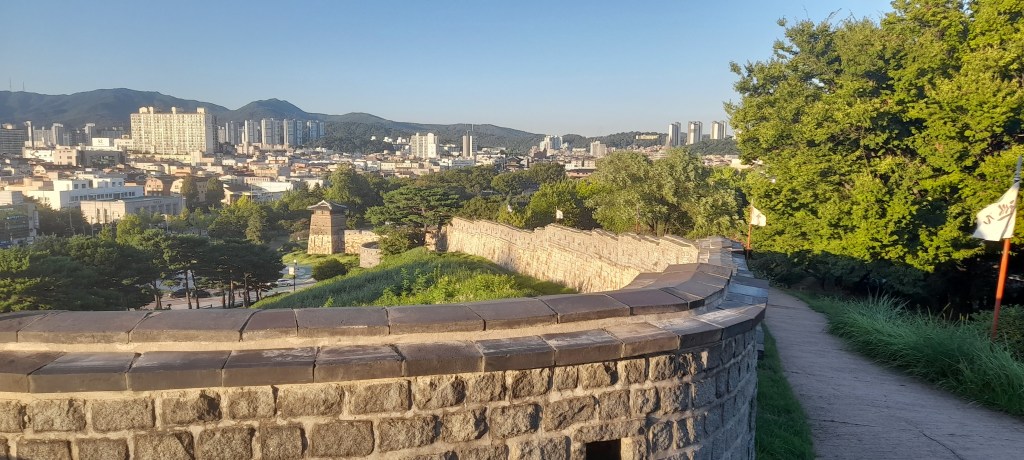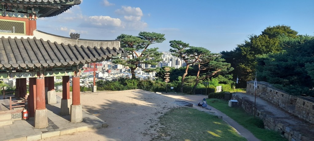 Et c’est partit pour 360 marches ! Je cavale à bon rythme et arrive modérément essoufflé à la tour de garde ouest : Seojangdae. Depuis la petite tour de défense attenante, je prends le temps de me régaler du panorama, réalisant enfin que, ça y est, je suis en Corée.