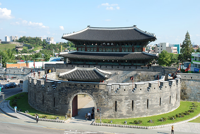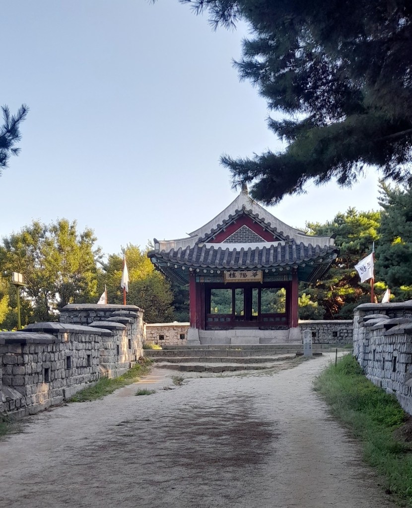 À la pointe méridionale des remparts, avant de redescendre la colline vers l’orient, un petit pavillon est accessible au bout d’un court chemin ensablé : Hwayangnu. Les ajussi (messieurs étant en age d’être pères, globalement) que j’y croise l’empruntent pied nu, alors je suis gracieusement le mouvement. Un peu partout, j’aurais le plaisir de pouvoir ôter mes chaussures. La Corée est un pays où l’on se déchausse souvent.