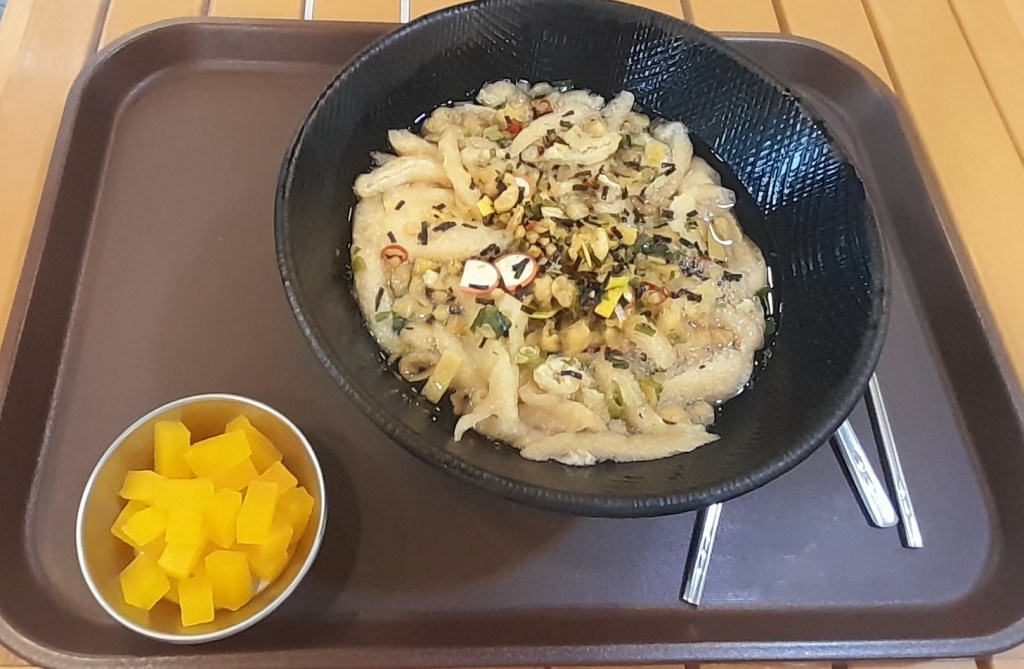 De nouveau à attendre dans le hall de la gare de Suncheon, j’ai faim. Un petit boui-boui à prix abordable propose des bols de nouilles udon avec du tofu frit. C’est pas foufou mais j’ai la flemme d’aller plus loin. Je me bouche une dent creuse pour 5000 wons (3 euros 30). Je profite de ce temps libre obligatoire pour écrire mon journal de voyage. Puis, je pars pour Busan.