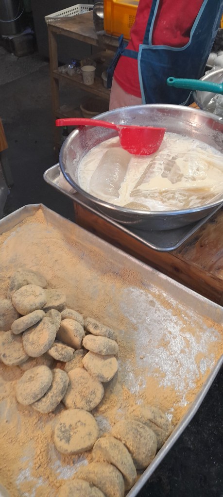 Sur un étal de tteok, les gâteaux de riz coréens, une poignée de gens commande des sucreries et mange à même l’étal, une soupe blanche aux vermicelles, dans laquelle flotte des bouteilles de glace pour maintenir la préparation fraiche : le Kongguksu. Intrigué, je m’intègre au groupe et commande la même chose. Je me régale. J’en profite pour m’emporter du petit-déjeuner pour le lendemain.