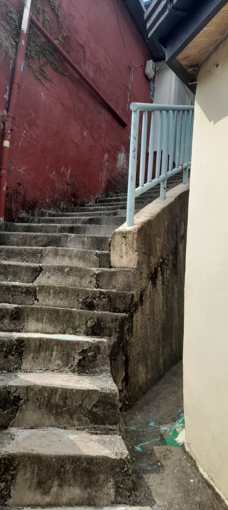 Le bus me dépose en bas du quartier et je monte à pied, entre les petites maisons, dans des passages étroits et escarpés. Si de loin, toutes ces couleurs sont chatoyantes, une fois à proximité, on constate l’état presque délabré des bâtiments, le béton qui s’effrite, les caniveaux ouverts, les poubelles entassées dans les coins.
