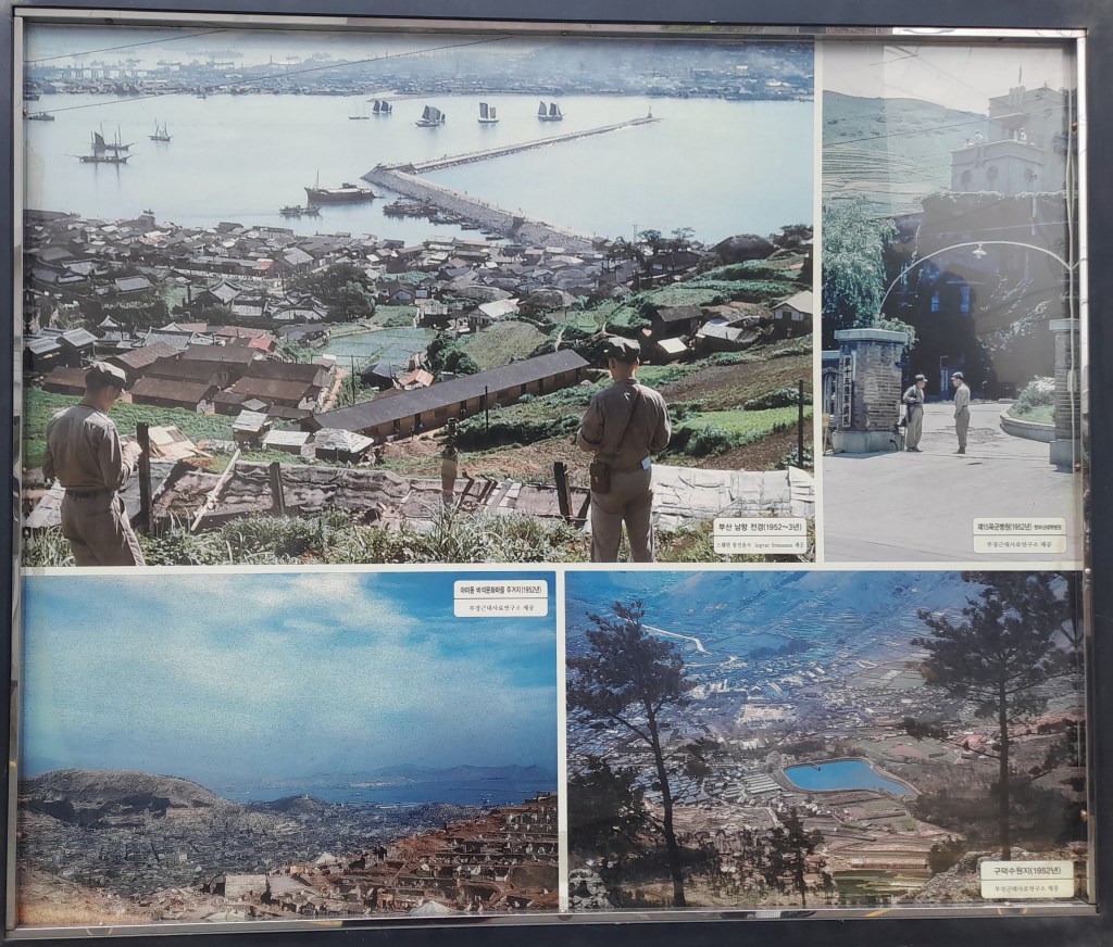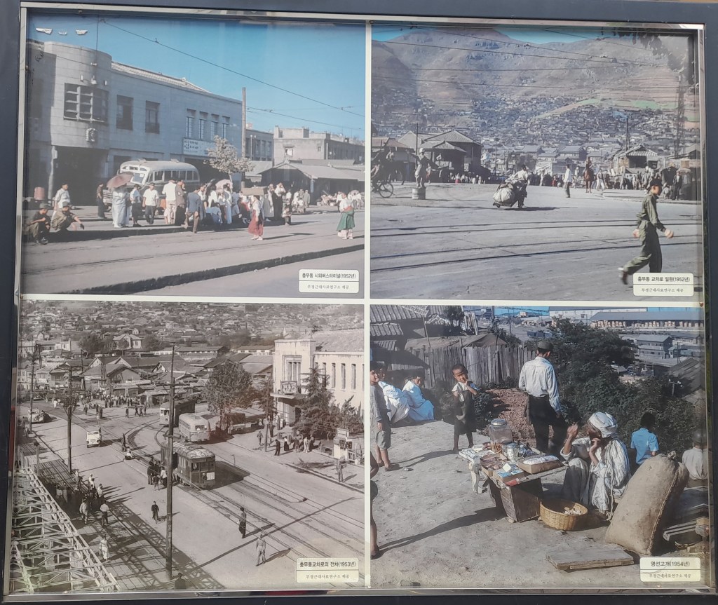 J’ai un peu peur de me perdre dans ce dédale urbain, mais à force de monter, je débouche finalement sur une voie suffisamment large. Sur plusieurs panneaux, des photos en noir et blanc montrent Busan durant l’occupation japonaise, puis après.