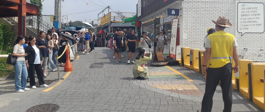 Pour la première fois, je croise de nombreux touristes, je passe donc inaperçu. Je rencontre rapidement deux français venus, en vacances. Un autre touriste me propose de me prendre en photo avec mon téléphone et j’accepte gracieusement. Je croise aussi des gens en hanbok. Il y a plusieurs magasin proposant des services de location. Au vu de la chaleur, je n’ai absolument pas envie d’essayer de me draper dans du plastique. Mais il faut avouer que l’esthétique est plaisante.