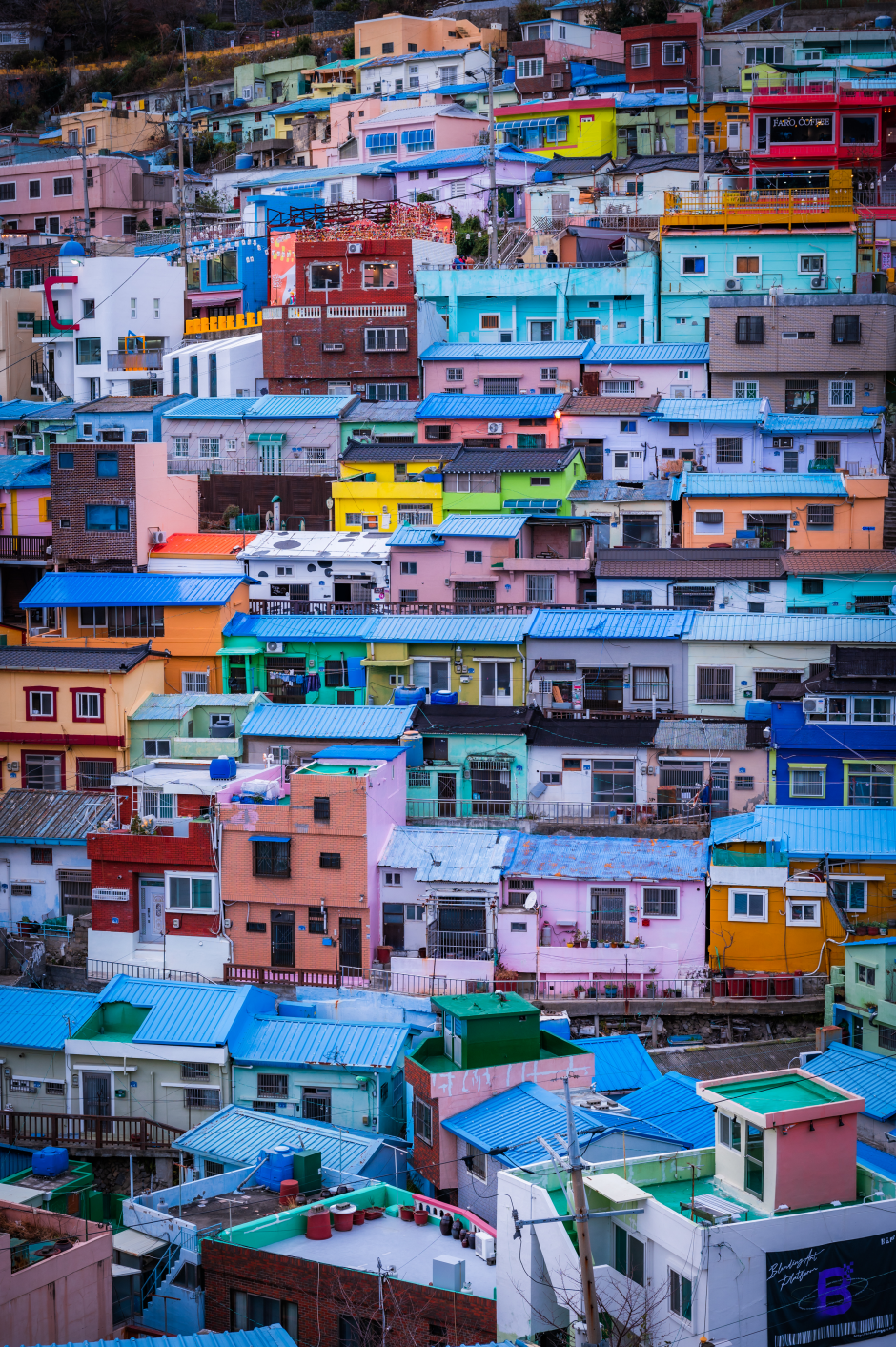 Aujourd’hui, je tire leçon de mes erreurs, je me remet en short, une chemise légère et surtout, des baskets car ce matin, c’est direction le quartier Gamcheon. Cet entassement de petites maisons aux murs colorées s’étend à flanc de colline. Les images que l’ont voit sur internet, donnent un air pittoresque à ce quartier pauvre reconvertit en attraction touristique.