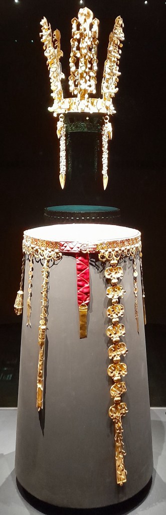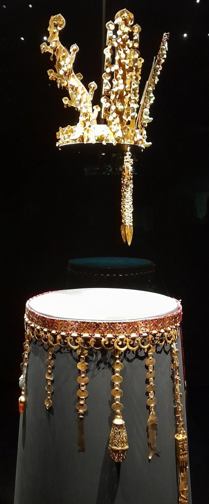 Au dessus : Parure royale, ceinture et couronne. Époque Silla.