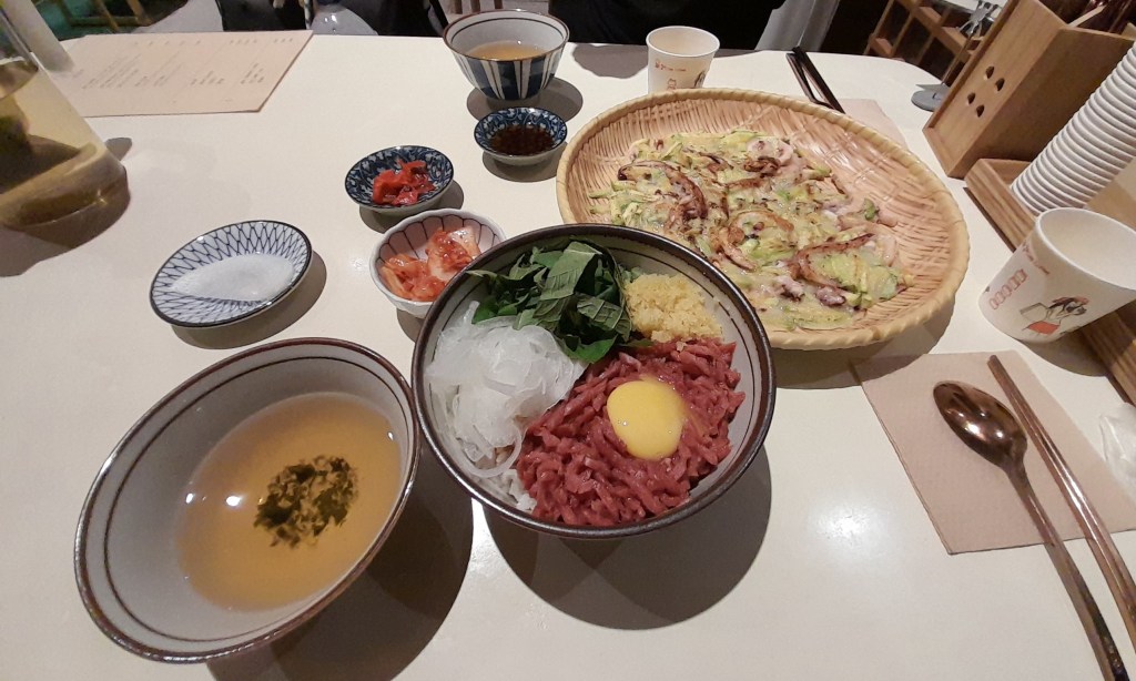quand nous ressortons, il fait nuit et nous avons fort faim. Heureusement, de nombreux restaurants sont ouverts. Nous commandons un bibimbap au bœuf cru et une crêpe pajeon.