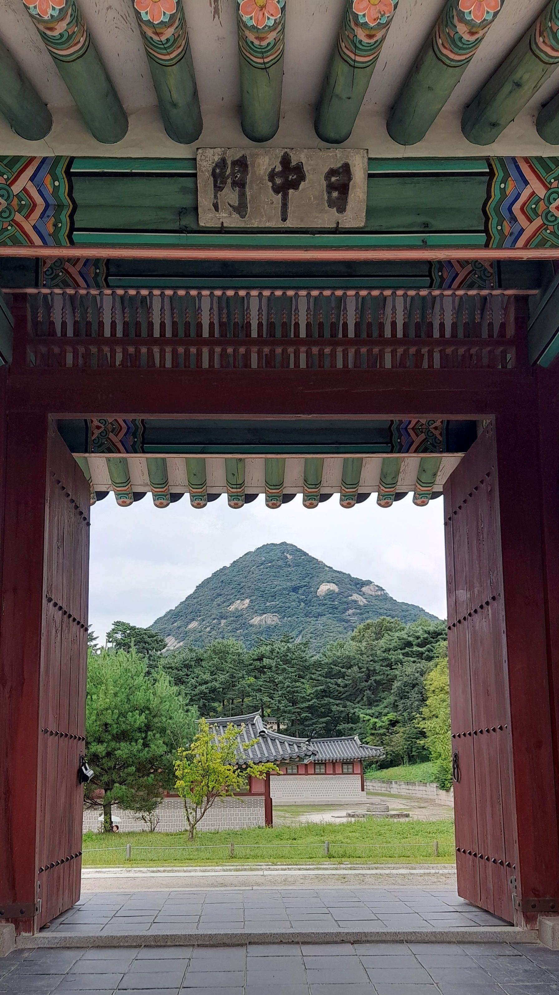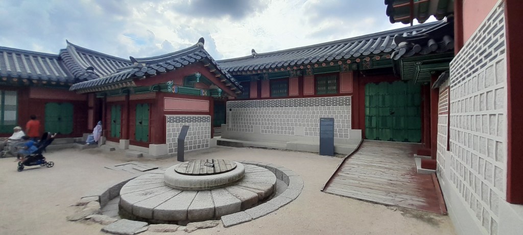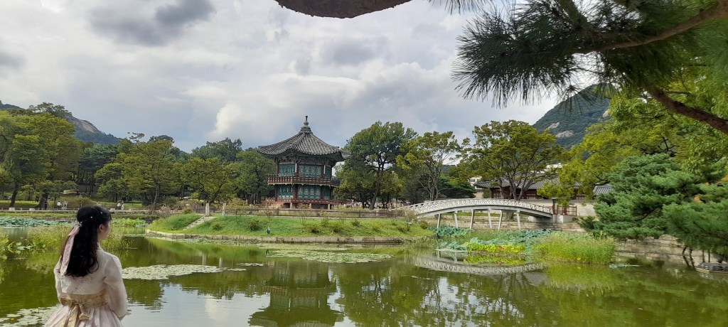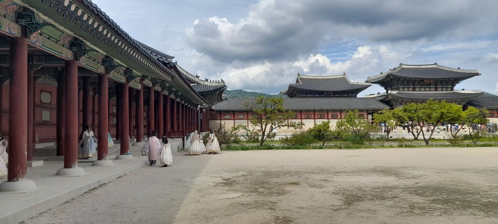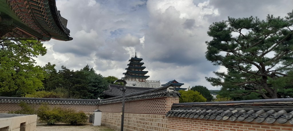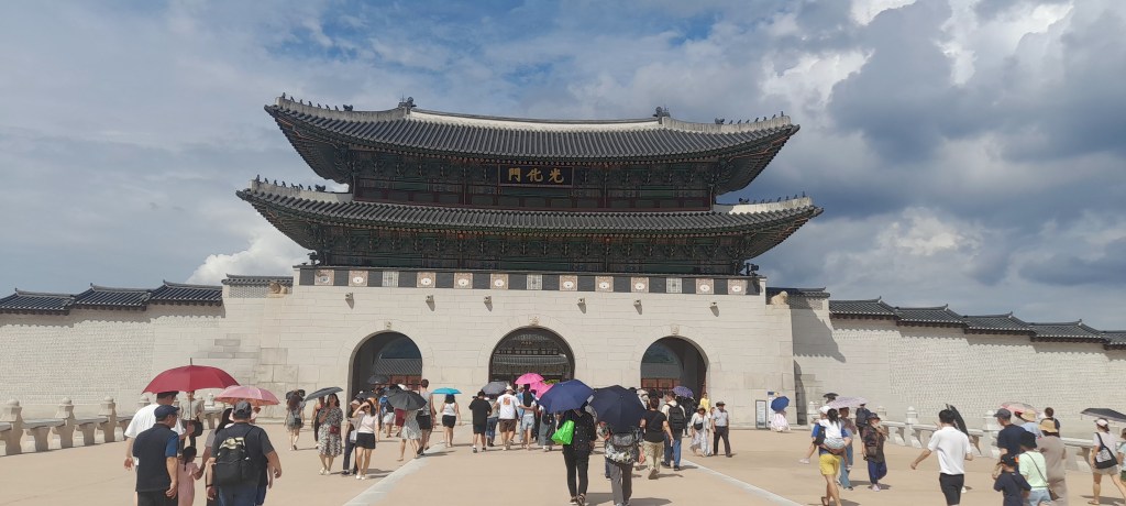 Ce jour là, c’est chuseok 추석 ! La fête des récoltes, le jour de la pleine lune. Jour de congé national, le pays est en fête. Les familles se réunissent, de nombreux établissements sont fermés et les palais royaux sont toujours gratuits. Alors, je prends ma journée pour visiter le palais principal, le plus grand, placé devant la maison bleue (l’office du président de la république de Corée, équivalent de notre palais de l’Élysée) : Gyeongbokgung.