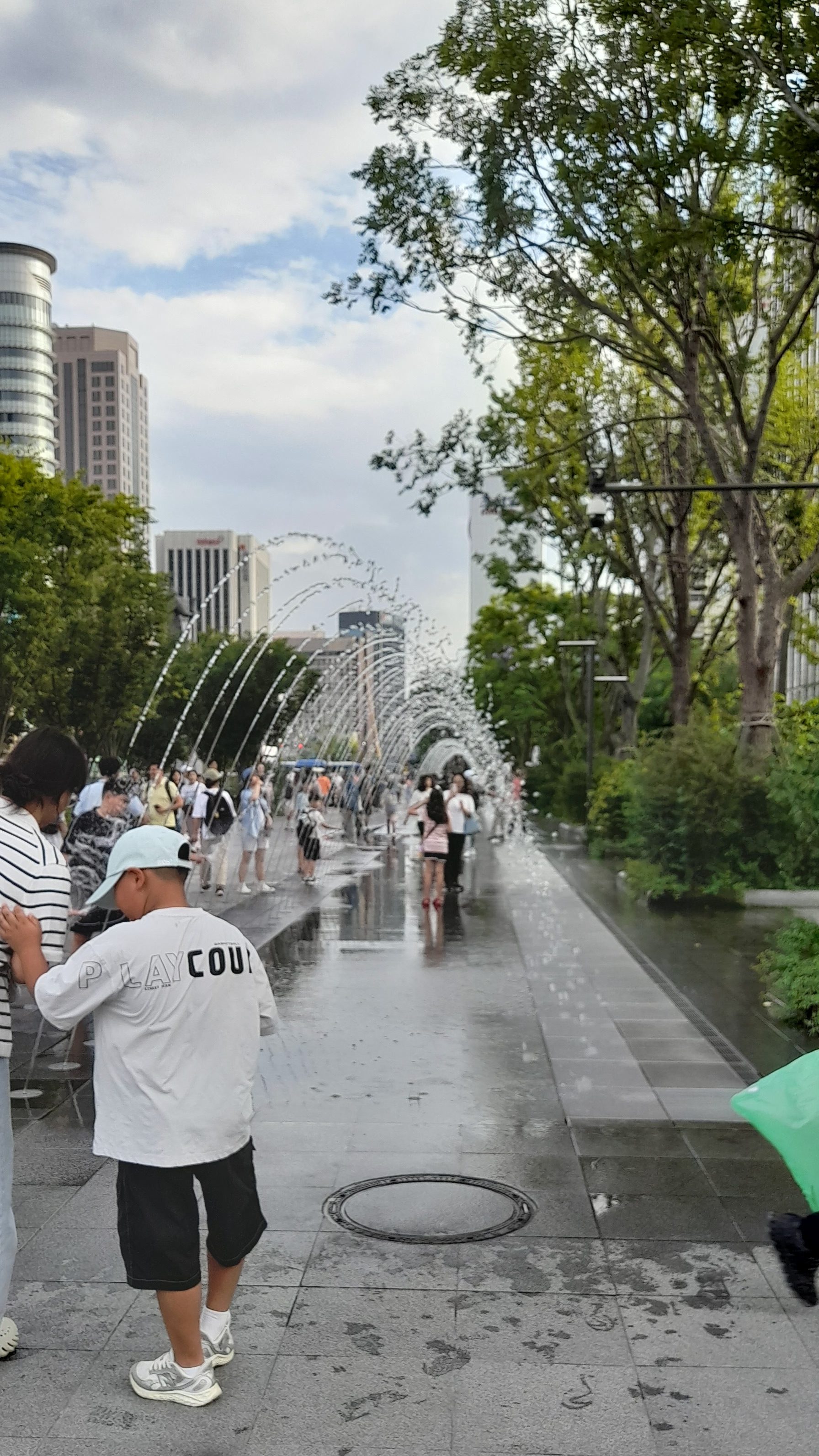 En sortant du palais, sur la grande place, il y a une petite manifestation. Je poursuit mon chemin. Des jeux d’eau ont été aménagés pour que grands et petits puissent se rafraichir un peu, dans la touffeur de cette fin d’été.