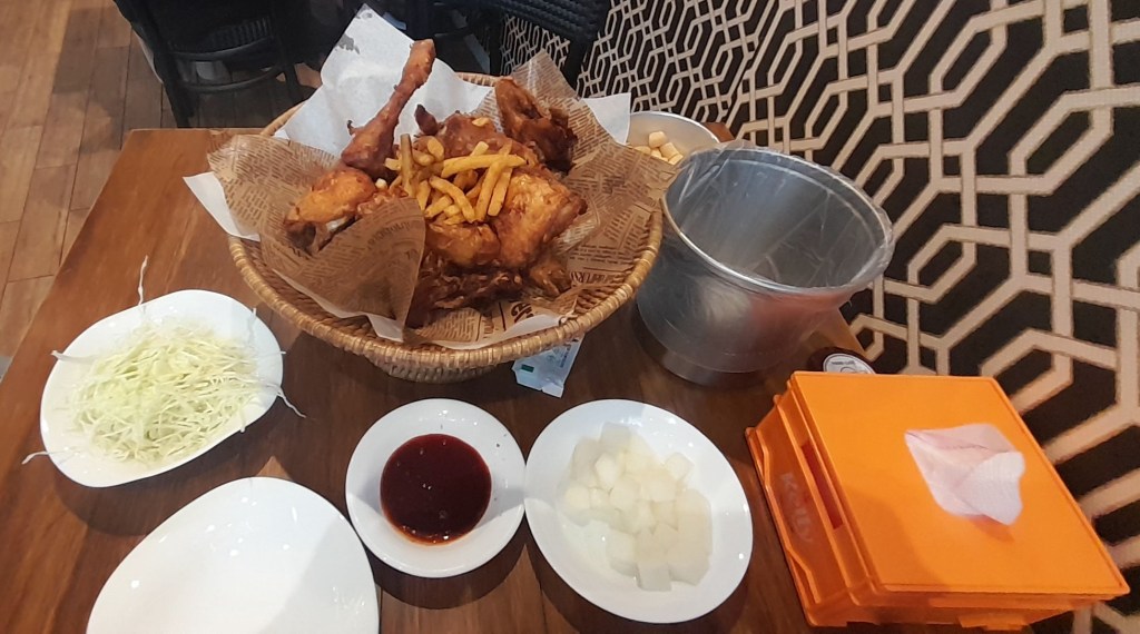 Après cette longue visite, j’ai faim. Hors, enfer et damnation, jour de fête nationale signifie, commerces fermés. Le premier restaurant ouvert que je trouve à proximité du palais est un établissement de poulet frit. Je n’ai d’autre choix que de me faire servir une portion pour deux personnes.